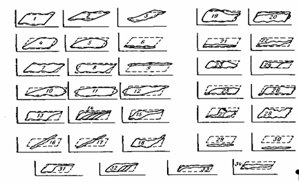 1-3 - нормальная работа насоса: Н<1000 м, H>1000 м, H>1500 м соответственно; 4-6 - утечки в нагнетательной части: средняя, большая утечки; выход из строя нагнетательной части соответственно; 7 – 9 - утечки в приемной части: средняя, большая утечки, выход из строя приемной части соответственно; 10-12 - утечки в приемной и нагнетательной частях; 13-15 - влияние газа на работу насоса: влияние пластового газа; изменение контура; влияние газа н утечки в нагнетательной части соответственно; 16-18 - прихват плунжера насоса: НСН2, НСВ1 c выходом из замковой опоры, заедание песком соответственно, 19 -20 - утечки в НКТ; 21-22 – фонтанирование; 23 — высокая посадка плунжера в НСН2; 24 - то же, в НСВ1 без слива из замковой опоры; 25 - низкая посадка плунжера в НСН2; 26 - то же, в НСН1; 27, 28 - негерметичность насоса; 29 - обрыв или отворот штанг в нижней части; 30 - то же, в верхней части; 31-34 - низкий динамический уровень (33 - пробка, 34 - заедание песком).