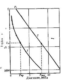 Рисунок 4 - Кривые распределения давления по стволу скважины (1) и колонне НКТ (2).