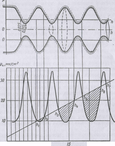 Движение жидкости в каналах переменного сечения (рис.4) под давлением, возникающим на мениске, изучалось М.М. Кусаковым и Д.Н. Некрасовым. Было установлено, что самопроизвольное перемещение границы раздела жидкостей продолжается до тех пор, пока приращение потенциальной энергии по высоте (длине) канала не становится равным нулю (dU/dh=0), т.е. до отметки, на которой достигается равенство капиллярного давления гравитационному перепаду его. Эти отметки в каналах авторами названы "равновесными высотами". На рис.4 равновесные высоты фиксируются пересечением эпюр капиллярного давления и гравитационного перепада по длине канала.