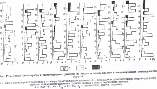 Затемненные площади рис.5, образованные пересечением эпюр капиллярного давления и гравитационного перепада по высоте каналов, эквивалентны дополнительной внешней энергии (работе), необходимой для преодоления мениском равновесных высот. Видимо, глубокая капиллярная пропитка нефтенасыщенных пористых сред будет происходить при условии, когда равновесные высоты будут преодолеваться мениском при помощи внешних сил. В условиях прерывистой и разнородной смачиваемости поверхности пор пленочное движение воды также возможно, только оно не обеспечивает существенной пропитки водой нефтенасыщенных слоев.