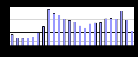 Графік погодинного водоспоживання води за добу для населеного пункту будуємо, відкладаючи по осі ординат години доби, а по осі абсцис погодинні витрати води в населеному пункті (табл.2, стовпець 26). Побудований графік наведений на мал.2.