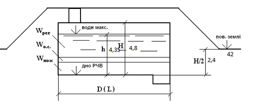 дна РЧВ = пов. землі – H/2 = 42 –4,8/2 = 39,6 м.