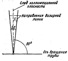 2. Визирная ось зрительной трубы V-V1 должна быть перпендикулярна к оси вращения трубы H - H1 (рис. 2). Методика поверки зависит от особенностей отсчетной системы прибора. Теодолит с односторонним отсчетным устройством (мы используем теодолит ТЗО) устанавливаем по цилиндрическому уровню. Зрительную трубу переводим в положение КП (вертикальный круг справа от окуляра) и визируем на удаленную, четко видимую точку (угол дверного проёма), расположенную приблизительно в горизонтальном направлении. Наведя вертикальную нить на изображение точки, берем отсчет П1 по горизонтальному кругу. Отпустив закрепительный винт, переводим трубу через зенит. Освободив алидаду, наводим трубу на ту же точку и при втором положении вертикального круга КЛ (круг слева) берем отсчет Л1 по горизонтальному кругу. Отпустив закрепительный винт подставки теодолита, поворачиваем его верхнюю часть вместе с лимбом на 180°. После этого повторяем указанные наведения и берем новые отсчеты П2 и Л2. Вычисляем угловую величину с неперпендикулярности осей. Угол с называют коллимационной погрешностью