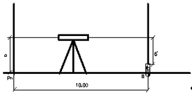 Задача решается на ровном участке местности. Преподаватель задает положение репера, его высота равна 120,50 м. На расстоянии 10 м от репера требуется построить точку В высота которой 120,77 м (рис. 16). В точке В, где должна быть построена высота, забивается деревянный колышек, верхняя часть которого устанавливается заведомо выше предполагаемого положения точки В.