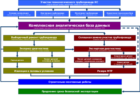Техническое состояние технологических трубопроводов газоперекачивающих компрессорных станций (КС) с увеличением сроков их эксплуатации, требует разработки системы специальных мероприятий по обеспечению заданного уровня надежности, так как эксплуатация за пределами расчетного ресурса сопровождается повышением вероятности аварий, в том числе и с тяжелыми экологическими последствиями. В настоящее время, внедрение инновационных средств технической диагностики позволило заменить традиционную систему эксплуатации с регламентным ремонтно-техническим обслуживанием - на эксплуатацию по техническому состоянию, т.е. к обслуживанию в зависимости от степени риска, от реального состояния и фактических характеристик объектов. Для выполнения существующих повышенных требований к экологической и технической безопасности – требуется развитие и внедрение единой системы экспертно-диагностического обслуживания (ЭДО) трубопроводов, являющейся важным инструментом реализации стратегии эффективного управления основных фондов.