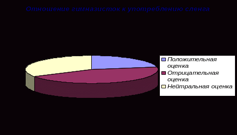 Когда я предложила своим одноклассницам ответить (письменно, на листках) на вопросы: а) «Как вы относитесь к тому, что молодежь активно употребляет жаргонную лексику?»; б) «Употребляете ли вы ее сами?»; в) «Делаете ли вы замечания, если в вашем присутствии кто-либо злоупотребляет жаргонной лексикой?» и др. вопросы (дополнительные, устные), с помощью которых можно было установить истинное (а не формальное, ради того, чтобы только что-то сказать) отношение к употреблению жаргонизмов, я получила разнообразные ответы, но выявленная тенденция (отрицательное или избирательное отношение) в них проявилась очень отчетливо. Приведем некоторые показательные отзывы.