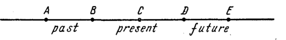Let us further suppose that the train is now at station C. This is, so to say, the present. Stations A, B and all other stations passed by the train are the past, and stations D, E and all other stations the train is going to reach are in the future.