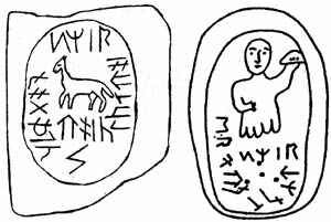 Рис. 133. Рунические надписи на микоржинских камнях. Предположительное чтение на камне с изображением лошади: «воин (кмет) Богдан инавой с» (Я. Потоцкий) или «с мир(ом) бог дан воин(ам) с Литвой» (К. Рогавский). Предположительное чтение на камне с изображением человека: «Прове, Сбир, Кбел» (Я. Потоцкий) или «С мир Прове чест», то есть «С миром в честь Прове» (К. Рогавский).