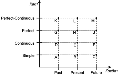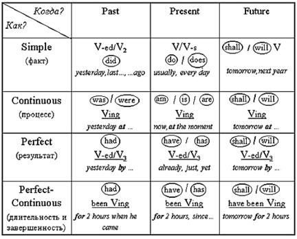 | Present Indefinite I play usually - обычно He (she, it) plays sometimes - иногда We play often - часто You play seldom - редко They play every day - каждый день | Непр. гл. - II форма←Past Indefinite→ Прав. гл. - ed I played yesterday - вчера He (she, it) played last week - на We played прошлой неделе You played long ago - давно They played When did? Where did? two days ago - 2 дня назад | Future Indefinite I shall play tomorrow - завтра He (she, it) will play next year - в We shall play следующем году You will play soon - скоро They will play in a year - через год |