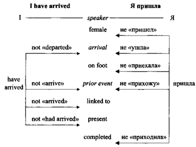 Из приведенной схемы видно, что английское предложение содержит пять элементарных смыслов: 1) говорящий (первое лицо); 2) прибытие (без указания на способ передвижения); 3) прошедшее время (not «arrive»); 4) связь с другим действием или моментом времени (значение перфекта); 5) связь с моментом речи (not «arrived»). Русское предложение содержит шесть элементарных смыслов: