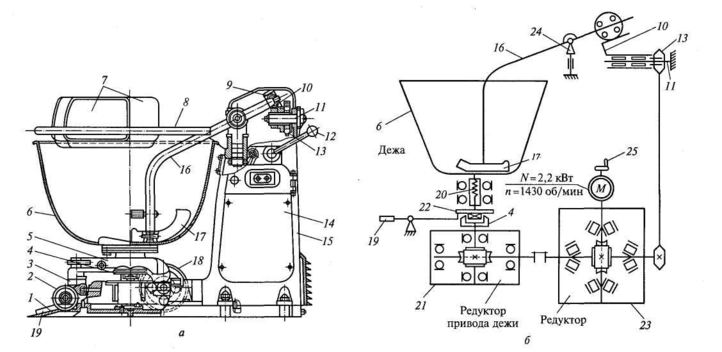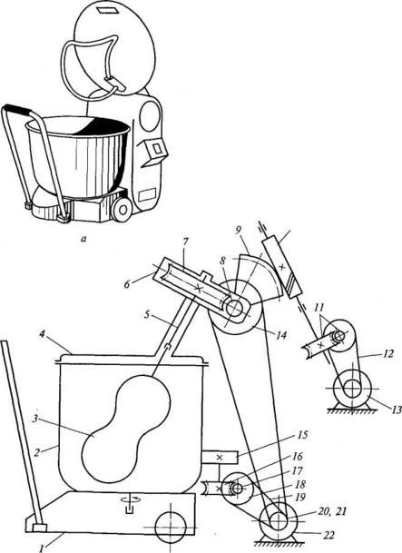 а — общий вид; 6 — кинематическая схема; 1 — тележка; 2 — дежа; 3 — рабочий орган; 4 — крышка; 5 — рабочий вал; 6 — корпус траверсы; 7, 16 — червячное колесо; 8, 10, 17 — червяк; 9 — червячный сектор; 11 — червячная передача; 12 — клиноременная передача; 13 — реверсивный электродвигатель; 14, 18, 20, 21 — шкивы; 15 — фрикционное колесо; 19 — клиновой ремень; 22 — электродвигатель