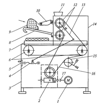 1— электродвигатель; 2— червячный редуктор; 3 — каркас; 4— винтовая пара; 5 — маховик; 6 — валок транспортера; 7 — транспортер; 8 — загрузочный лоток; 9 — продукт; 10 — предохранительная решетка; 11 — бункер для муки; 12 — раскаточные валки; 13 — поворотный кронштейн; 14 — рама; 15 — натяжной валок; 16 — цепная передача; 17 — кулачковая муфта