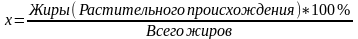 При расчете удельного веса жиров растительного происхождения также следует учитывать только растительные жиры. Оптимальным является содержание 30% жиров растительного происхождения, обеспечивающих поступление в организм полиненасыщенных жирных кислот, жирорастворимых витаминов.