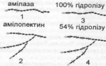 В амілопектині р-амілаза розщеплює лише верхівки розгалужених ланцюгів. Дія ферменту припиняється на відстані одного елементарного глюкозного залишку до розгалуження. В результаті гідролізу залишається високомолекуляр-ний декстрин. |!-амілаза розщеплює амілопектин з утворенням мальтози лише на 54%. Утворені високомолекулярні декстрини («-амілодекстрини) піддаються подальшому гідролізу а-амілазою і розпадаються на низькомолекулярні декстрини, на які знову починає діяти р-амілаза. Навіть при сумісній дії а і р-амілаз при гідролізі амілопектину залишаються декстрини з 5-8 глюкозними залишками, в яких зосереджені а-1,6 глюкозидні зв'язки. При одночасній дії обох амілаз крохмаль гідролізується на 95%.