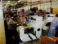 Готовые брикеты вермишели подаются на конвейер упаковочного агрегата, где комплектуются пакетиками с сухими и жидкими специями и автоматически раскладываются модульным фасовочным автоматом на подающий ленточно-цепной конвейер.