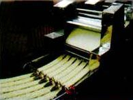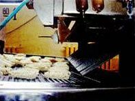 Во фритюрной системе поступающая нарезанная вермишель раскладывается в лотки, непрерывно подаваемые конвейером во фритюрную ванну. Температура масла должна составлять 160...180 °С Во время прохода во фритюре вермишель подвергается окончательной термической обработке. Вермишель формируется в брикеты по форме лотка.