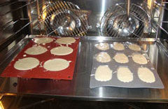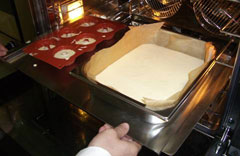 Выпечка бисквитного теста производится в печах различной конструкции (электрошкафах, туннельных, тупиковых и т.д.). Время выпечки бисквитного полуфабриката зависит от целого ряда факторов и составляет в среднем 40-70 мин при температуре 170-190°С.