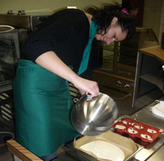 Бисквитное тесто сразу же после его приготовления отливается в формы или на транспортерную ленту печного конвейера. Перед заполнением форм дно их необходимо застелить бумагой, а борта смазать сливочным маслом. Формы тестом следует заполнять на ¾ их высоты, чтобы тесто в процессе выпечки не выливалось.
