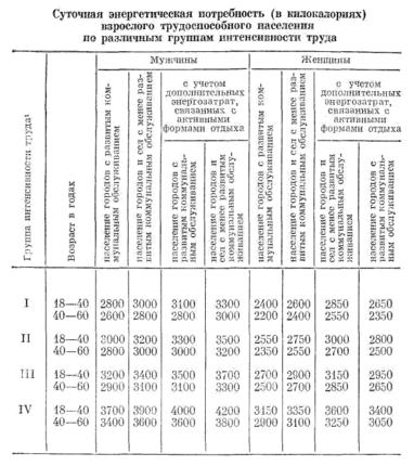 Группы интенсивности труда подробней описаны в главе 2. Отсюда следует, что я отношусь к I группе. Далее, по таблице 1 определяю, что суточная энергетическая потребность в ккал = 2400.