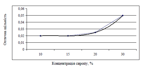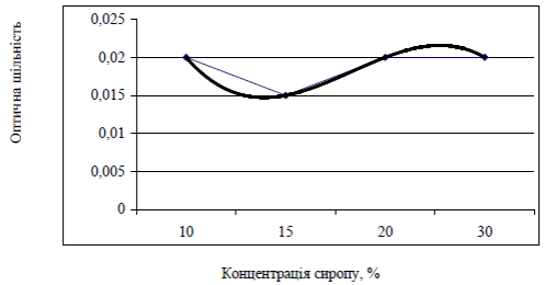 У сиропі зі збільшенням його концентрації збільшується оптична щільність забарвленого розчину, починаючи від концентрації 15 %, що подано на рисунку 5.