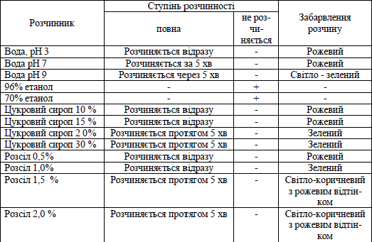 У продукти харчування (напої, кондитерські вироби і т.н.), як правило, барвник вносять у вигляді розчину певної концентрації, тому доцільно було виявити здатність отриманого нами барвника розчинятись у різних розчинниках.