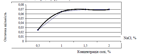 Рисунок 3 – Залежність інтенсивності забарвлення розчинів барвника від концентрації солі в них