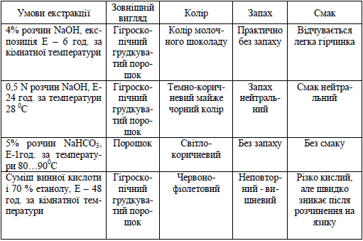 Згідно таблиці 1, виділений нами за опублікованими методиками барвник має різні органолептичні характеристики.