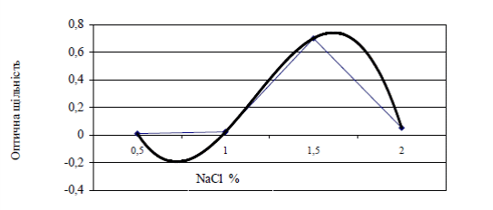 Згідно рисунка 3, у розчинах кухонної солі меланіновий барвник виявляє пароболічну залежність. Рівняння регресії має вигляд: