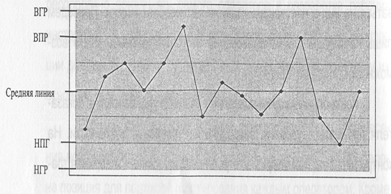 При внедрении системы мониторинга очень эффективно использовать статистические методы - контрольные карты. Контрольные карты строятся на основе данных, собранных при проведении мониторинга, и показывают, как меняется контролируемый параметр во времени. Применение контрольных карт позволяет наблюдателю определить, какие колебания контролируемого параметра являются случайными, а какие являются статистически важными и показывают изменения процесса вследствие особых причин. Это позволяет своевременно, до нарушения критических пределов проводить наладку процесса. Значительные колебания параметров могут также показывать обои на предыдущих этапах, стадиях. Таким образом, контрольные карты - это графическое представление результатов наблюдений, которые позволяют наблюдателю оперативно заметить выход процесса из-под контроля.