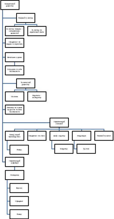 Персонал этой кофейни составляют 31 человек, которые находятся в непосредственном подчинении управляющего кофейней. Организационная структура данного предприятия относится к линейно–функциональному типу. Такая структура позволяет в значительной степени устранить недостатки как линейного, так и функционального управления. При этой структуре назначение функциональных служб - подготовка данных для линейных руководителей в целях принятия компетентных решений или возникающих производственных и управленческих задач. Для каждой должности существует должностная инструкция, все сотрудники подчиняются правилам и стандартам сети кофеен.
