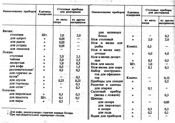 Достаточное количество столовой посуды, приборов, содержащихся в безукоризненном порядке, — необходимое условие хорошей организации работы ресторана. Сейчас согласно принятым нормам (таблица 1) в ресторане предусматривается не менее трех комплектов предметов сервировки на место.
