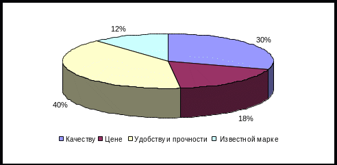 Как показывают данные, представленные на рис. 2.2, при выборе детской обуви родители в первую очередь обращают внимание на удобство и прочность изделия. Именно такой ответ выбрали 40% респондентов. 30% опрошенных отдают приоритет качеству обуви, 18% - цене и 12% - известной марке. Эти данные подтверждают факт приобретения детской обуви 12-ю процентами респондентов в фирменных магазинах.