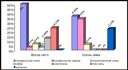 Как наглядно показывает график, изображенный на рис. 2.4, большинство опрошенных родителей в качестве материала изготовления детской обуви не зависимо от сезона предпочитают натуральную кожу. При покупке весенне-летней обуви для детей в качестве материала изготовления пользуется популярностью текстиль (24,2%), синтетика (12,9%) и лишь потом искусственная кожа (6,5%), натуральная замша (3,2%) и нубук (3,2%). Предпочтения при выборе обуви осеннее-зимнего сезона отдаются в основном натуральной замше (33,8%) и валенкам (23,1%), а также искусственной коже (6,2%). Обувь этого сезона из нубука и синтетики не приобретает никто из опрошенных родителей.