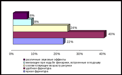 Из рис. 2.6. достаточно хорошо видно, что самым привлекательным дополнительным элементом детской обуви является удобная фурнитура (40%), внимание 24% родителей в первую очередь привлекают соответствующие возрасту ребенка рисунки, 22% обращают внимание на яркую фурнитуру, 8% - на мигающие при ходьбе фонарики, встроенные в подошву и лишь 6% - на различные звуковые эффекты. Различные световые и звуковые эффекты привлекают в основном родителей малышей, а вот удобство и оригинальность фурнитуры свойственно выбирать тем родителям, чьи дети уже сами умеют обуваться, так как этот в первую очередь интересно именно ребенку, не зависимо от того, мальчик он или девочка.