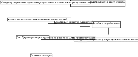 Структура агентства, люди и их функции. В большом рекламном агентстве с полным циклам услуг существует несколько рекламных “ячеек” - отделов, имеющих каждая управляющего по рекламе (и его помощников), ответственного за одну и более финансовых смет рекламодателя. Управляющий является связующим звеном между агентством и его клиентом; так, он координирует действия всех участников рекламной кампании и заботится о том, чтобы она закончилась успешно.