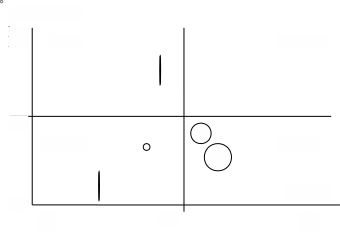 На вертикальній осі відкладаємо прогнозні значення зростання (зменшення) темпів зростання ринку - максимальне і мінімальне. Горизонтальна лінія ділить цей діапазон навпіл. На горизонтальній осі відкладаємо діапазон змін відносної частки ринку підприємства порівняно з конкурентом, який займає найбільшу частку ринку. Вертикальна лінія проходить через ту точку цього діапазону, починаючи з якої спостерігається зменшення питомих витрат, або через точку з відносною часткою ринку, що дорівнює одиниці.