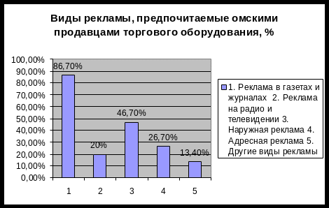 Согласно проведенным исследованиям, подавляющее большинство продавцов торгового оборудования наиболее эффективной рекламой своей продукции считают рекламу в газетах и журналах (86,7 процента), используется также наружная реклама (46,7 процента). Менее всего востребована реклама на радио и телевидении (20 процентов) и адресная реклама (26,7 процента).