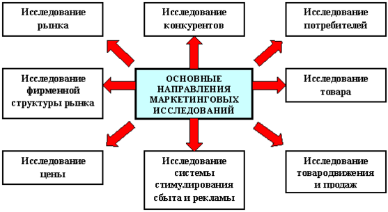 Направления маркетинговых исследований определяются возможным набором объектов для изучения. Существует несколько основных направлений маркетинговых исследований, каждое из которых имеет свой объект.