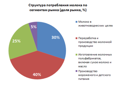 По данным Министерства сельского хозяйства и Росстата среди основных групп молочной продукции наиболее значительная доля рынка приходится на цельное молоко, кисломолочные продукты, йогурты, сметану, творог и сливки. Доля цельного молока на рынке составляет около 84% в количественном выражении. Следующими по значимости для потребления видами молочной продукции являются сыр, занимаемая доля рынка около 8%, затем масло с долей рынка 5%. При этом важно отметить, что за последние пять лет потребление сыра в России возросло в три раза. На фоне роста всего объема молочного рынка и значительного прироста сырного сегмента, потребление масла и цельного молока растет намного медленнее, рост составляет примерно 6-8% в год. В сегменте цельномолочной продукции, увеличение наблюдается в натуральном выражении на 8% в год, наибольшую долю занимает стерилизованное и пастеризованное молоко, оно занимает долю 60% от всего рынка молочной продукции. Затем идут кисломолочные продукты, включая йогурты, этот сегмент рынка составляет более 25%, сметана 7%, творог 5%.