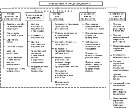 Ниже приведена одна из методик оценки имиджа компании, которая построена на предположении о том, что имидж, как инструмент воздействия на внешнее окружение, необходимо приближать к позитивному, увеличивая тем самым «рыночную силу» предприятия. Таким образом, параметры, характеризующие состояние корпоративного имиджа предприятия, представленные на рисунке 1.3, должны соответствовать позитивному имиджу4.