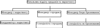 У відділі продажів та маркетингу працює 8 чоловік. Кожен працівник має свої права та обов’язки, які визначені посадовими інструкціями. Начальник відділу організовує, координує та контролює роботу відділу, також він має у своєму підпорядкуванні відділ бронювання, в якому працює 4 особи – менеджер та 3 спеціалісти. Схематично структура відділу маркетингу відображена на рис