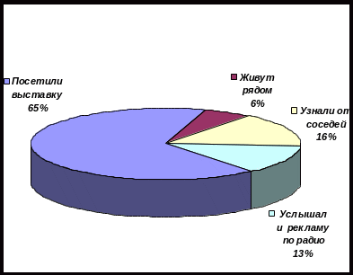 Остальные 35% поделились на тех, кто узнает о предприятии через рекламу по радио (16%), из рассказов соседей, узнавших о выставке (13%), и тех, кто просто живет рядом и зашел по пути (6%).
