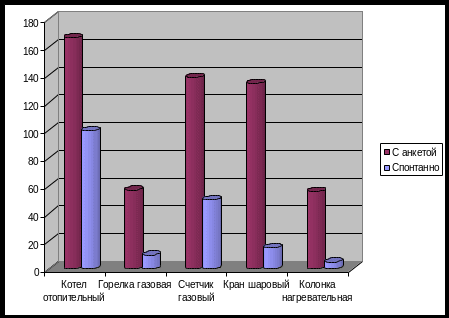 Из графиков видно, что мнение о том, что необходимо приобрести, значительно изменялось после того, как потребителям предлагалось несколько дополнительных вариантов. После того, как они видели в анкете, что могут приобрести что-то еще, они уже ставили не один крестик напротив того, за чем пришли, а принимали решение заказать и другое оборудование. Следует заметить, что за отопительным котлом пришло и так достаточно большое количество респондентов (50%), по этому даже после предоставления вариантов решение о покупке увеличилось незначительно, чего нельзя сказать о других видах газового оборудования. Так, например, изначально было принято 15 из возможных 200 решений о заказе шарового крана, а после предоставления анкеты – 134.