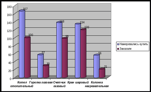 Однако, принятое решение о покупке не всегда свидетельствует о том, что продукт будет куплен, либо куплен именно в ближайшее время. К примеру, нагревательную колонку в тот день приобрели только 37,5% от того количества покупателей, которые собирались сделать покупку. Газовый счетчик приобрели 71% от потенциальных заказчиков. Шаровый кран – 89,5%, газовую горелку – только 52,5%, а отопительный котел –около 60%. Данные представлены на графике.