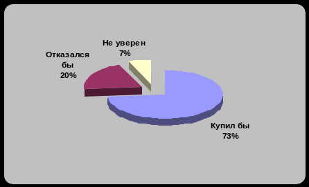 Опять же, данные результаты можно оспорить, ведь респонденты не видели котел и поэтому не могут до конца осознать всех преимуществ и недостатков этой модели. Мы не можем с уверенностью говорить, что, осуществив свой план по закупке таких котлов, они будут продаваться именно с такой тенденцией. Сейчас отказ от покупки может говорить о том, что у потребителя нет свободных средств, но через какое-то время ситуация может поменяться. То же можно сказать и про решение его приобрести. Мы получили результаты на данный момент, и они не гарантируют такое же положение дел в будущем.