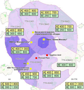 Рис. 4. Москва. Ставки аренды. Введенные объекты. Заявленные проекты