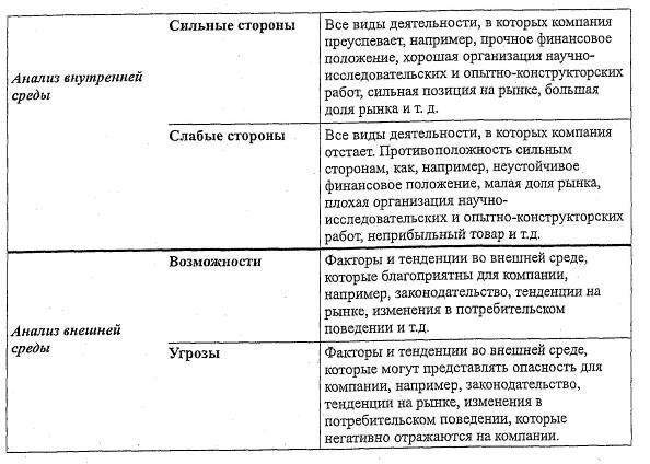 Анализ внешней среды относится к возможностям и угрозам, определенным в SWOT-анализе, и включает в себя следующие элементы:
