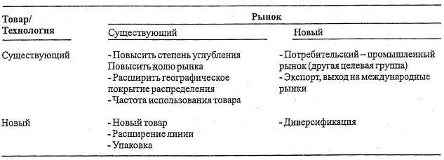 Комбинация «товар/рынок» представляет собой сочетание предметов обмена (товары и услуги) и субъектов операций обмена (рынки), основанное на стратегическом выборе потребностей, которые компания собирается удовлетворять, а также групп потребителей, на которые компания ориентируется.