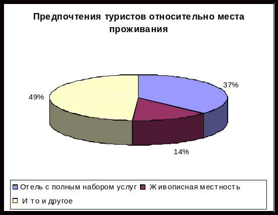 Если обратить внимание на диаграмму, которая находится в ПРИЛОЖЕНИИ 5, то можно сделать вывод: необходимы отели с живописной местностью для большинства туристов 37%+49%=86%. Из них 37% предпочитают лишь отель с полным набором услуг, но ясно, что для любой тур фирмы выгодно обеспечить клиентов отелем и живописной местностью чтобы был стопроцентный спрос.