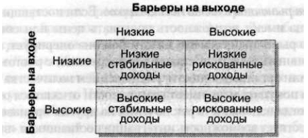 Наиболее привлекательным представляется рыночный сегмент с высокими входными барьерами и отсутствием особых препятствий на выходе: новым компаниям пробиться сложно, а фирмы, дела которых пошли не очень хороню, имеют возможность без труда покинуть «арену» (рис.4). Если барьеры на входе и выходе высоки, отрасль имеет высокий потенциал прибыли, однако повышается и степень риска, так как компании, дела которых идут вяло, остаются на рынке и вынуждены вести бесконечную борьбу. Когда оба барьера невысоки, фирмы без особых затрат приходят в новую отрасль и покидают ее, их доходы относительно невелики, но стабильны. Худший случай — «низкие» барьеры при вступлении на рынок и «высокие» — на пути к выходу (хронический излишек производственных мощностей и небольшие прибыли всех участников отрасли).